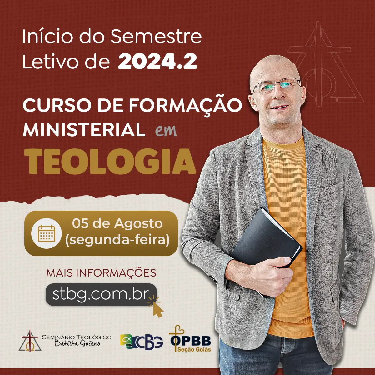 O Seminário Teológico Batista Goiano (STBG) está com as inscrições abertas para o novo semestre do Curso de Formação Ministerial em Teologia. As aulas do segundo semestre de 2024 terão início no dia 5 de agosto, uma segunda-feira. Essa é uma oportunidade imperdível para aqueles que desejam aprofundar seus conhecimentos teológicos e se preparar para o ministério.